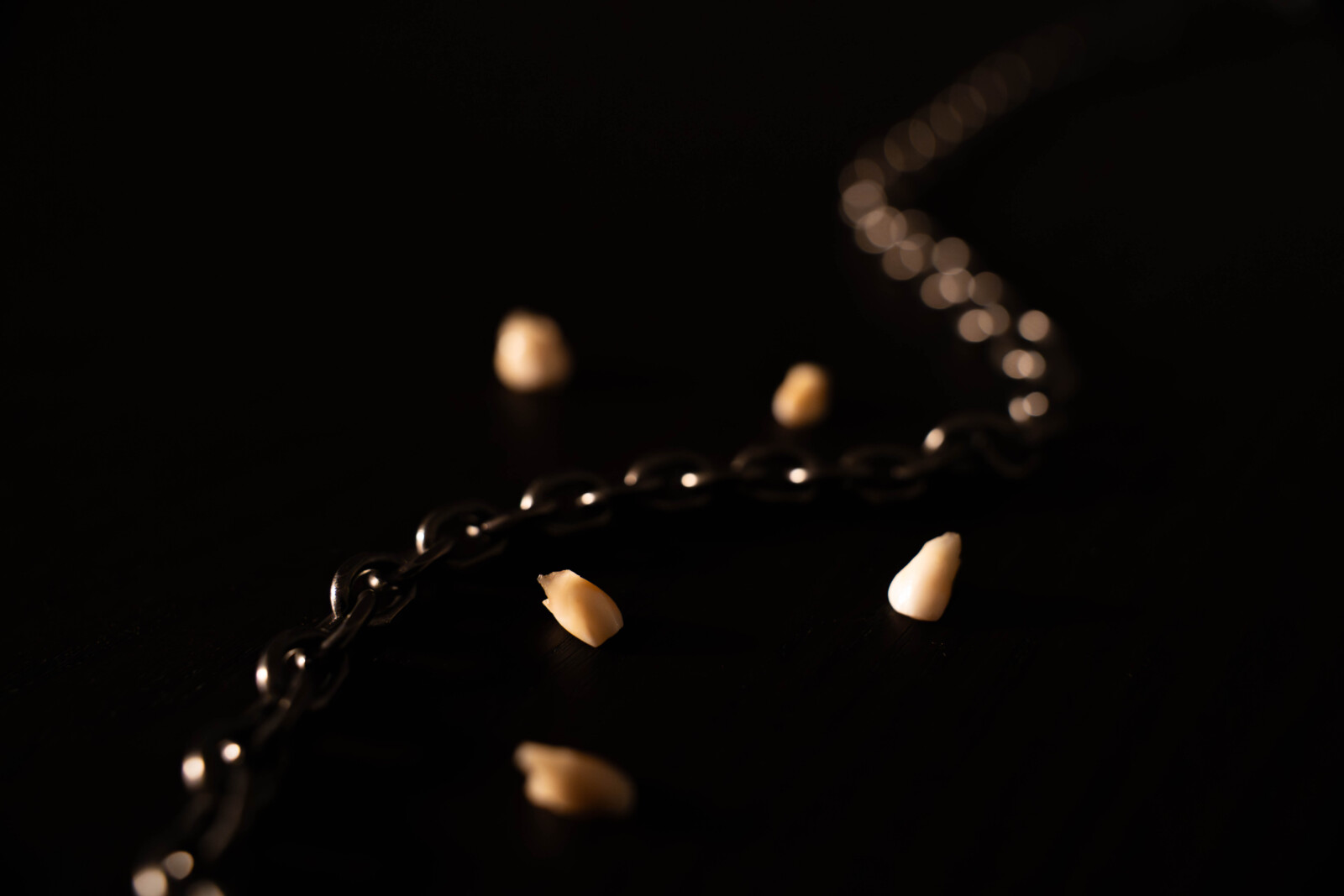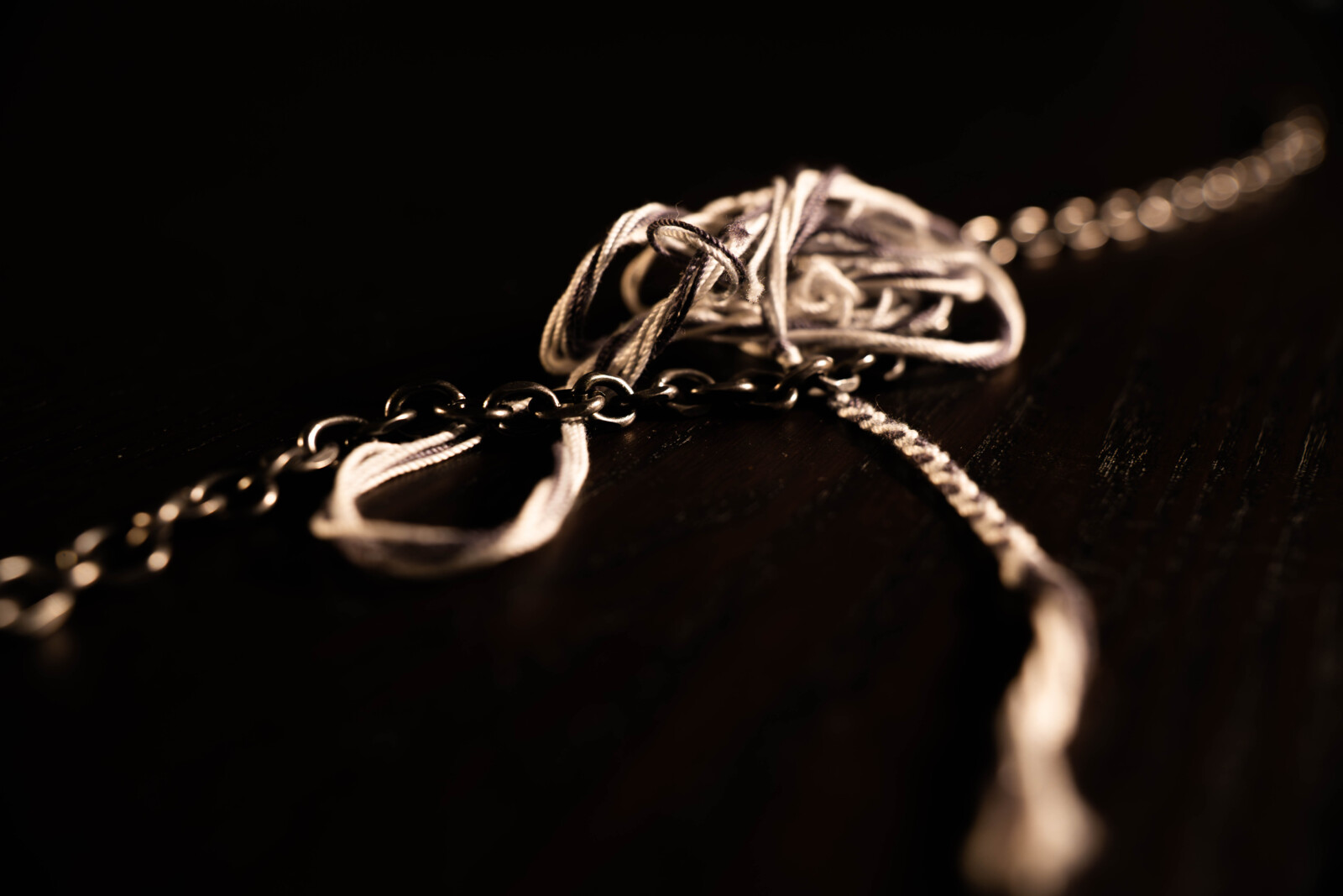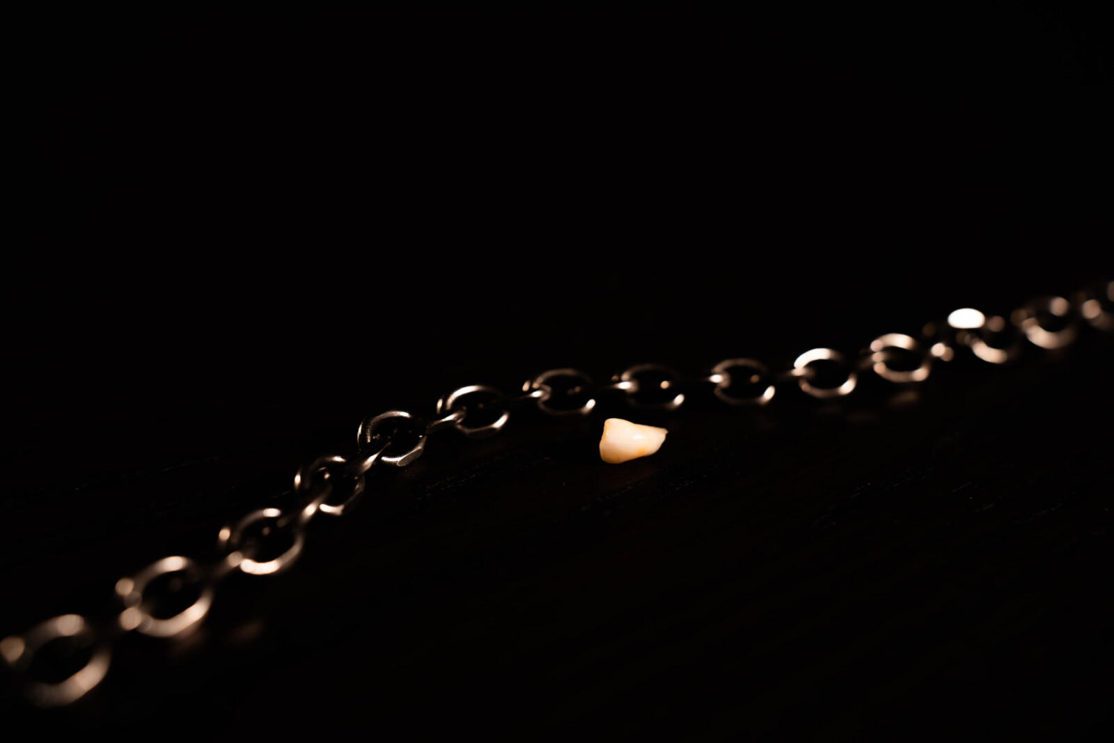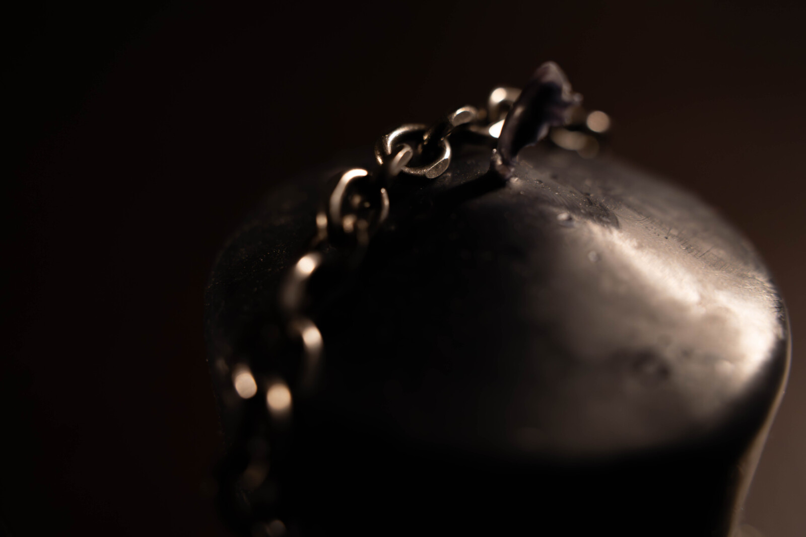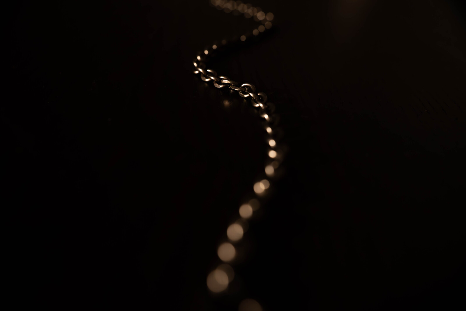 This is a series of Photographs, which declares the story of a chain, where its path started and where it followed, how it intertwines, what shaped it and made it wind to the place it ended up in the end. The objects it passes could be interpreted as symbolic – a watch, milk teeth, playing console memory cards, friendship bracelets, candles and a second chain. With a blooming Fantasy, a story unfolds: Of the beginning of a journey, growing up, playing games, using technology, making friends, having a fated encounter, all while time is running towards the end, with the flame of life burning down slowly. The photos are rather dark with little light spent by candlelight or the reflections of said objects, but mostly of the chain itself. This results in a moody, grungy atmosphere, reflecting the impending last ring in the chain.